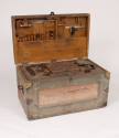 DescriptionGreen and tan painted wood tool chest filled with various carpentry tools. Copper and iron corner braces. Iron handles with raised embellishment on plates. Lid is covered in sheet metal and has leather handle and double lock. Sliding hinge on left side of lid. Paint has faded and exterior panels were left unpainted. Chest has been divided into 8 units to facilitate accessioning: 1. Lid of tool chest and key