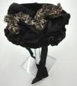 d. Hat - Black velvet with black grosgraine ribbon and brown/white crocheted wired trim. "Mme Heity Boyer, 28 Place Vendome, Paris" stitched in gold on black silk lining of hat....not in this box. Located in 3A, Bay 10, Shelf 1