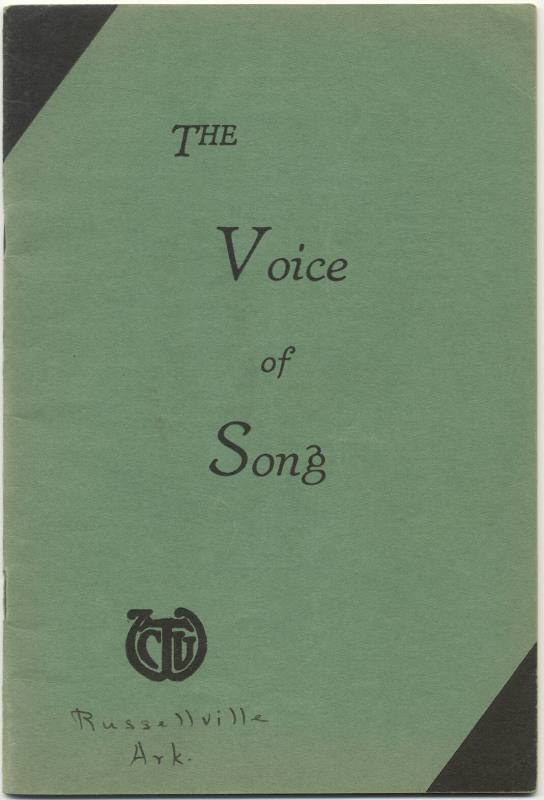 DescriptionGreen song book, "The Voice of Song", containing songs and hymns used by the WCTU in their conventions, meetings, parades, etc. Written in black ink at bottom of cover "Russelville, Ark."