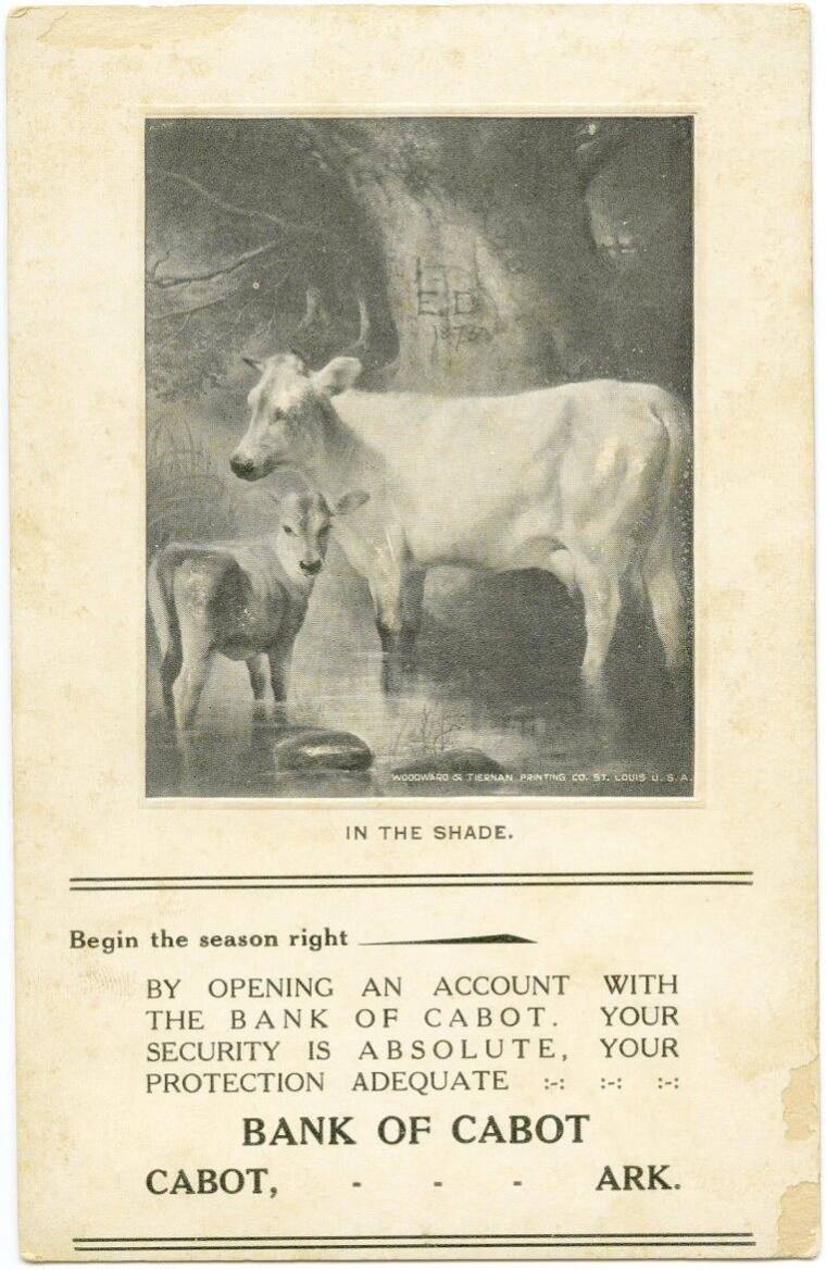 DescriptionPostcard with embossed image of two cows with the caption "in the shade." The text reads "Begin the season right by opening an account with the bank of Cabot. Your security is absolute, your protection adequate. Bank of Cabot, Cabot, Ark." The back is addressed to Miss Lillion Bryant, Cabot, Ark. There is a canceled 1 cent stamp from Cabot, December 9th.