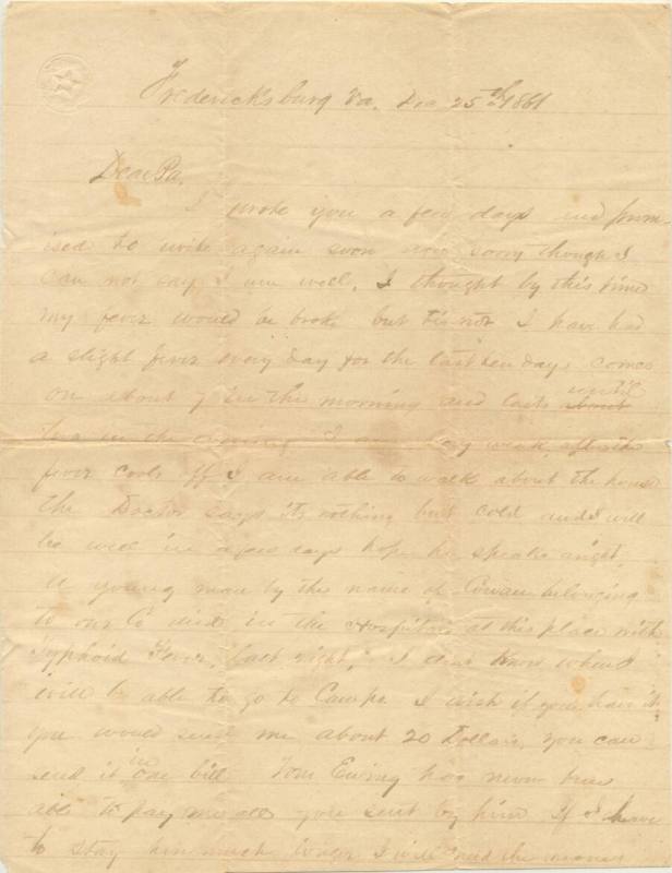 I wrote you a few days and promised to write again soon am sorry though I can not say I am well. I thought by this time my fever would be broke but tis not. I have had a slight fever every day for the last few days. Comes on about 7 in the morning and lasts until two in the evening. I am very weak after the fever cools off I am able to walk about the house .the doctor says its nothing but cold and I will be well in a few days. hope he speaks right. A young man by the name of Cowan belonging to our Co died in the hospital at this place with Typhoid Fever, last night, I don't know where I will be able to go to Camps. mI wish if you have it you would send me about 20 dollars. you can send it in one bill. Tom Ewing has never benn able to pay me all you sent by him. If I have to stay here much longer I will need the money. I will write you again in a few days. I hope you are all well. My love to all, your Son Alex E. Spence