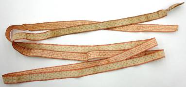 DescriptionStiff cardboard box covered in pink floral-patterned fabric, trimmed with pink ribbons. Handsewn. Fair condition.Status