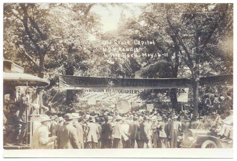 DescriptionBlack and white reproduction photo of U.C.V. reunion in 1911. Photograph, reprinted on modern Kodak glossy paper, depicts a large crowd in front of the Old State House. "Old State Capitol/U.C.V. Reunion/Little Rock, May.16 - 11" written in white at the center of the original image. The Old State House is barely visible except for the statue atop the pediment. In the foreground are a trolley on the left and an early automobile on the right. Banners are hung from the trees in front of the building, advertising the functions of the building - headquarters, lodging, registration, etc. The original image does not fit the proportions of the modern photograph paper, leaving a thin white bar at the bottom of the image.Identical to 1996.002.01.