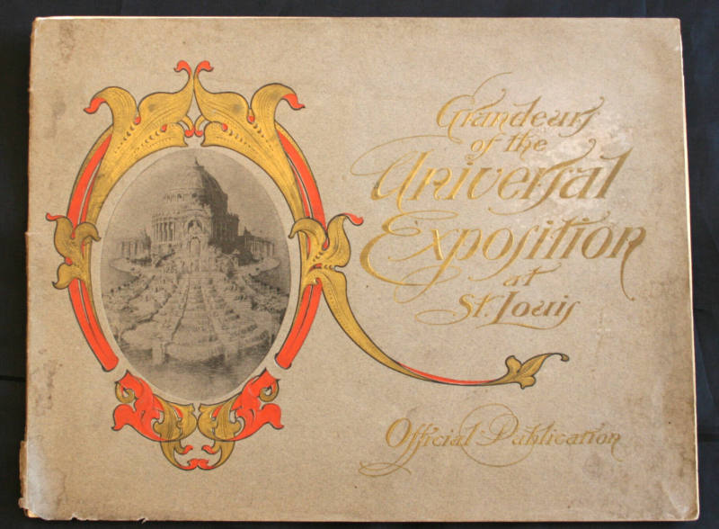 DescriptionBook titled "Grandeur of the Universal Exposition at St. Louis Official Publication."The book's cover is colored gray and has gold lettering on it. There is also an oval drawing of a domed building with elaborate water fountain in front of it (the Festival Hall and Cascades). The drawing is framed with orange and gold artwork.