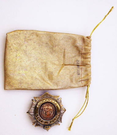 DescriptionArkansas Police Badge (with blue velvet bag) worn by A.G. Albright. Mr. Albright was the First Commander of the Arkansas Rangers prior to serving with the Arkansas State Police. Round gold badge with eagle on top. A blue and gold Seal of the State of Arkansas. Around the badge in etched blue letters: "Supervisor, A.G. Albright Arkansas State Police".