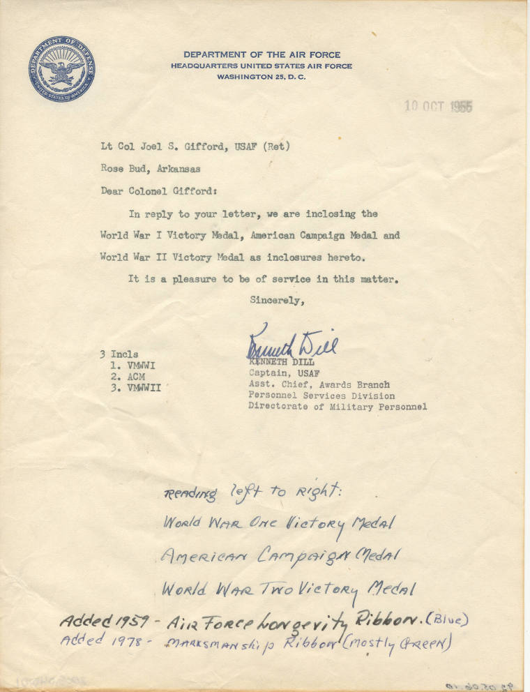 DescriptionOctober 10, 1955 letter to Lt. Col. Joel S. Gifford of Rose Bud, Arkansas from Kenneth Dill (Captain, USAF, Asst. Chief, Awards Branch, Personnel Services Division). The letter is enclosed with the following medals for GIfford's service: World War I Victory Medal, American Campaign Medal, and the World War II Victory Medal.
