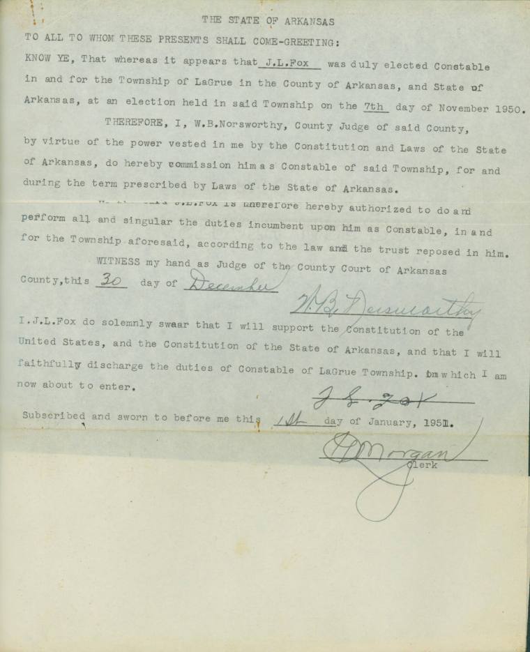 DescriptionElection notice for J.L. Fox. Fox was elected constable for La Grue, Arkansas County, Arkansas, on 7 November 1950. The commission statement was declared by Arkansas County Judge W.B. Norsworthy on 30 December 1950, and Fox accepted the position 1 January 1951.Status