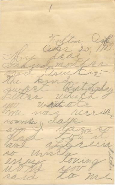 DescriptionLetter to Rev. CA Broach from Elizabeth Broach. Written at Henderson, Tenn. Cream colored, blue-lined paper. Birthday letter. Four pages and envelope.Status