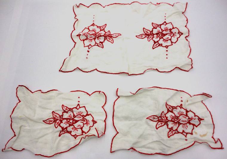 DescriptionDresser scarf set in red on white embroidery and cutwork by Lucinda Daniel Watkins, Mother of Myrtle Watkins Vowell. Lucinda was born is Arkansas on Jan.29,1874 to Andrew Jackson Daniel (b. 1850 d. 1903) and Cora Esther Cox (b. 1851 d. 1889)Lucinda married Robert D. Watkins on Mar. 23,1900. She died Dec. 24, 1951 of heart failure in Springhill, LA.