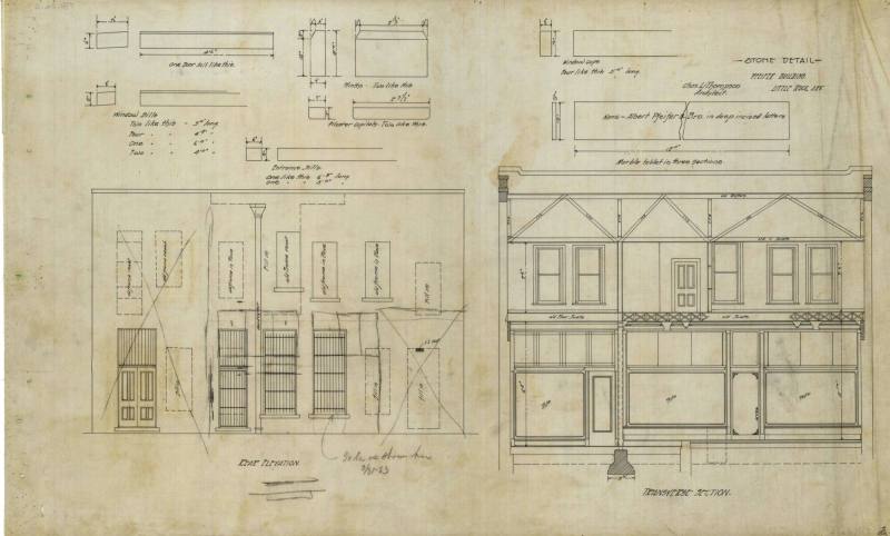 DescriptionPlans for new store bldg for Albert Pfeifer and Bro. in Little Rock (Pulaski County), AR; rear elevation and transverse section and stone detailStatus