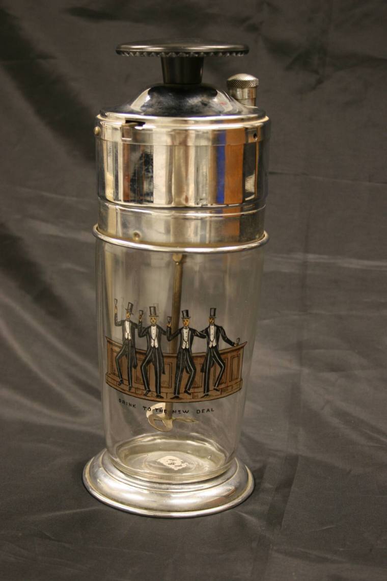 DescriptionGlass and metal drink mixer that depicts four men in top hats and tails holding champagne glasses in the air. Underneath reads, "Drink to the New Deal."Status