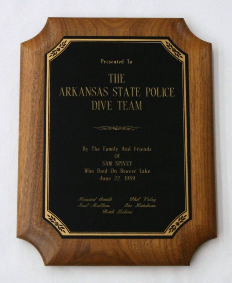 DescriptionArkansas State Police Plaque; "Presented to the Arkansas State Police Dive Team by the family and friends of Sam Spivey who died on Beaver Lake June 22, 1989. Howard Smith, Phil Velez, Joel Mullins, Joe Hutchins, Rick LeBow"Status