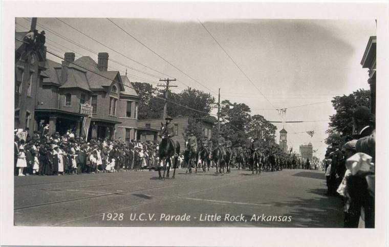 Description"United States Cavalry"; reproduction postcard. Front image is a black and white photograph of a parade street scene. The subject of the photograph is a procession of uniformed men on horseback, with onlookers standing along the sidewalks in front of residential houses. The reverse is blank.