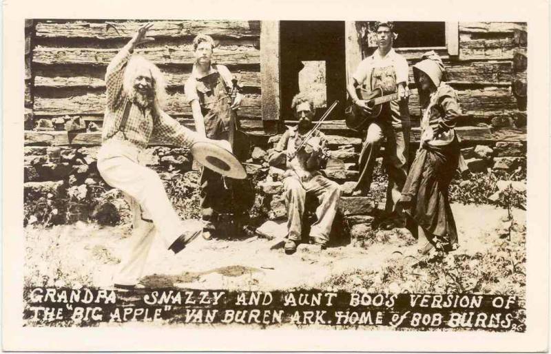 DescriptionBlack and white postcard photograph of a comedy scene from the Bob Burns series based on his family in Van Buren, Arkansas. It is a scene of a family in front of a log cabin. There are four men one dancing and three playing musical instruments and one woman dancing. They are dressed as hillbillies. At the bottom of the postcard: "Grandpa Snazzy and Aunt Boo's version of the Big Apple, Van Buren, Arkansas Home of Bob Burns". Uncirculated.Bob Burns was born on August 2, 1890, in Greenwood, Arkansas, and grew up in Van Buren, Arkansas. He was a musical comedian who starred in radio programs and in movies from 1930 to 1947. He had two radio shows – “The Arkansas Traveler” and “The Bob Burns Show." He appeared in 10 movies. In addition to his work in radio and in movies, he wrote a weekly newspaper column for sixteen years. He was also the inventor of the musical instrument the bazooka, which includes a long pipe and a funnel and that functions as a crude trombone. Burns died February 2, 1956.