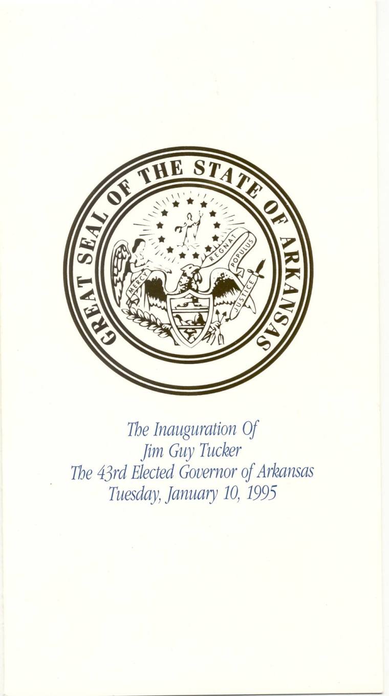 DescriptionInaugural Program for the 1995 Gubernatorial Inauguration of Jim Guy Tucker. White with blue lettering and a black state seal on the coverStatus
