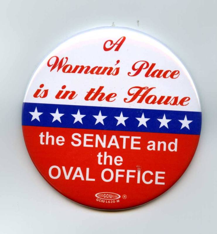 DescriptionHillary Clinton campaign button. Round. Red, white and blue. In red lettering at the top of the button: "A Woman's Place is in the House." In the middle section are 8 white stars. In white lettering at the bottom of the button: "the Senate and the Oval Office."
