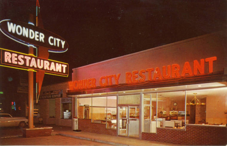 DescriptionColor postcard of the Wonder City Restaurant in West Memphis, Arkansas. The card shows a night time view of the restaurant's exterior.