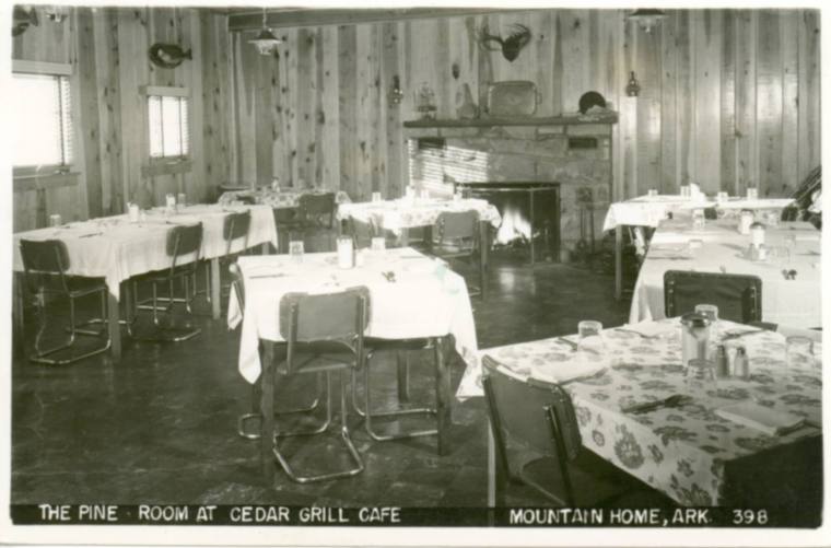 DescriptionBlack and white postcard of The Pine Room at the Cedar Grill Cafe in Mountain Home, Arkansas. The card shows the interior of the restaurant.