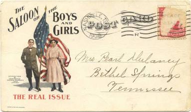 DescriptionWages of Sin postcard - black and white postcard with a drawing of a bartender standing behind 5 glasses on a bar, beneath the image, "The Wages of Sin." Image as a whole makes up a skull. Card is addressed to Mr. Walter Sierleban of Alexander, Arkansas. Although a message has been written, the card does not have a stamp or postmark. "25" appears in black in the upper left corner.