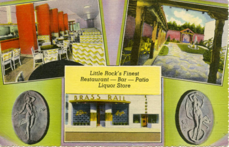DescriptionColor postcard of the Brass Rail Restaurant in Little Rock, Arkansas. The card shows exterior and interior views of the restaurant. In black lettering: "Little Rock's Finest/Restaurant-Bar-Patio/Liquor Store".