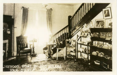 Color tinted postcard of the Bob Burns's home in Van Buren, Arkansas. The image shows a white two-story house with a screened-in front porch and steps leading up to the house. The house is set against a background of blue and pinkish skies. Shrubs and trees surround the house with grass in the foreground. "Bob Burns Home, Van Buren, Ark," written in black ink on the white border, is printed at the top of the image. The postcard was produced by S & S News of Fort Smith, Arkansas. Uncirculated.