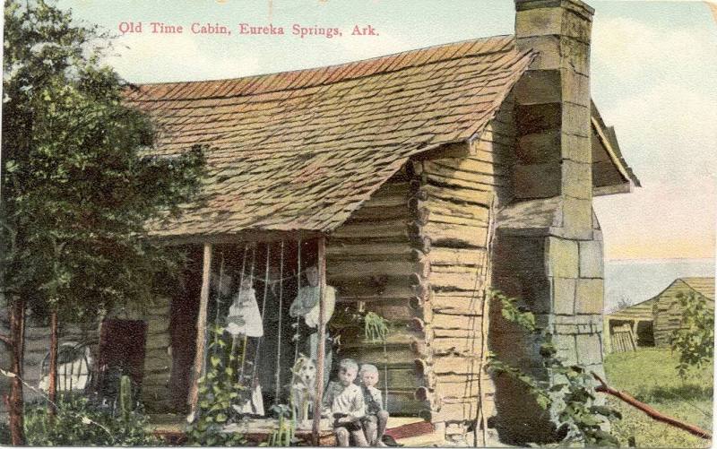 DescriptionPostcard with color tinted photograph of a log cabin and a family standing on the porch. On the front of the card in red lettering: "Old Time Cabin in Eureka Springs, Ark." On the back is a personal note. No postmark. Postcard made in Germany.
