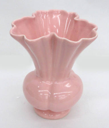 DescriptionOrange Bulbous Vase, two scrolled handles, "Camark" stamp on bottom. Scalloped rim, with two chips.
