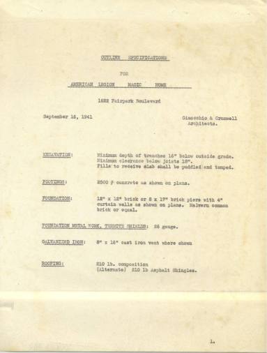 The document lists the specifications for the Reconditioning of Mr. Caruth's home. The construction consists of the addition of three rooms and front and rear porches. The document lists the work to be done by section, including sections such as shelving, flooring, etc.