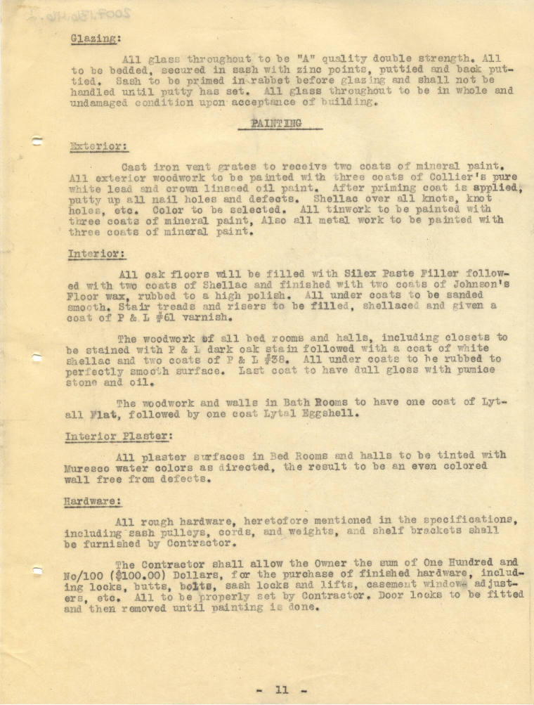 Plumbing and electric wiring are given their own separate sections in this document. These documents are office copies. They give general requirements for the construction, and detail certain aspects of the plumbing and wiring processes.