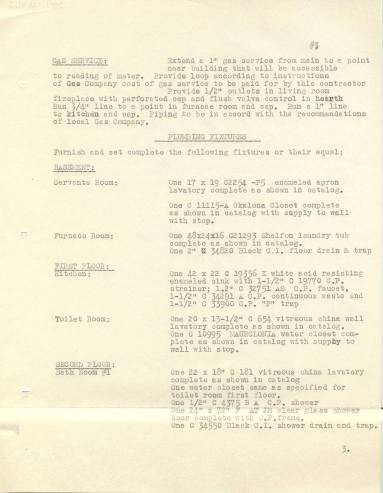 Instructions for the reconditioning of the home are given throughout the document. These include excavation, wrecking, clearing, etc. Electrical wiring is also described in detail. A handwritten note is attached to the document, expounding on a handful of the details of some of the construction areas.