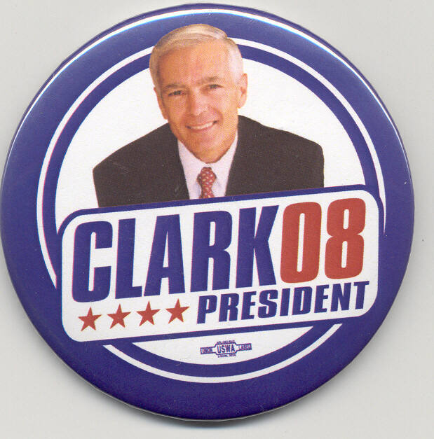 Description2008 Wesley Clark for President Campaign Button. Round, blue and white. Color photograph of Clark in top center. In blue and red lettering: "Clark/08/President".Status