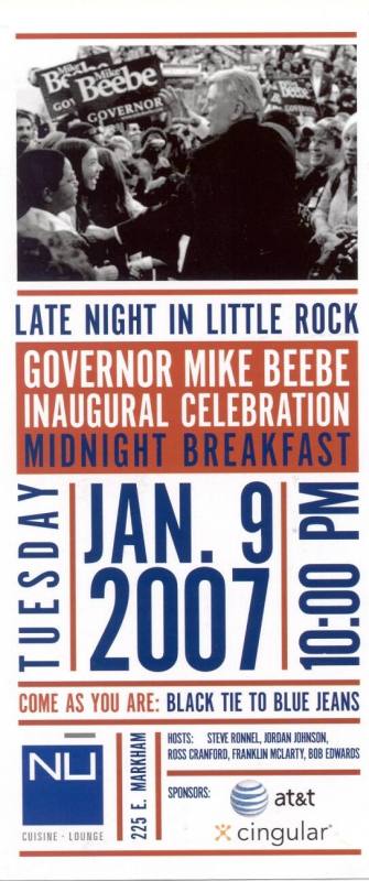 DescriptionInvitation to Mike Beebe's Inaugural Celebration Midnight Breakfast. White paper with blue and white lettering. At the top: black and white photo of Beebe greeting a crowd. "Late Night in Little Rock"Status
