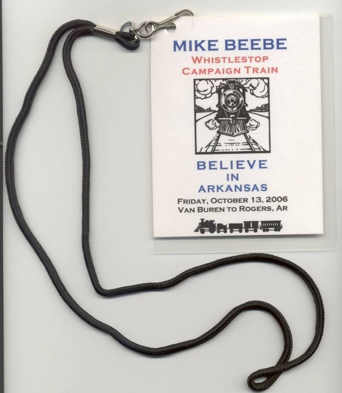 DescriptionA Mike Beebe's Whistlestop Campaign "Believe in Arkansas" pass. White laminated pass attached to a black lanyard. The pass is for Friday, October 13, 2006, from Van Buren to Rogers.Status