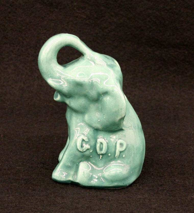 DescriptionGOP money bank. Blue-green ceramic elephant with G.O.P. on the side.Status