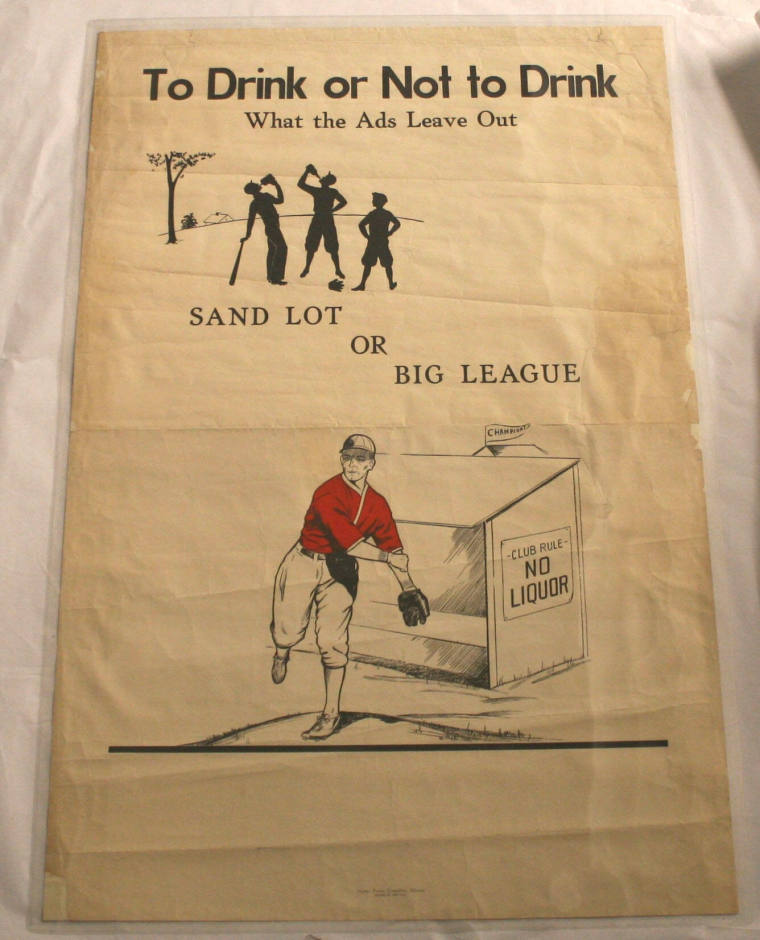 DescriptionProhibition poster that reads, "To Drink or Not to Drink / What the Ads Leave Out" across the top in black. It has a drawing of three kids drinking in a field, holding baseball bats and gloves and then below has a picture of a kid in a baseball stadium. In between it reads, " Sand Lot or Big League."