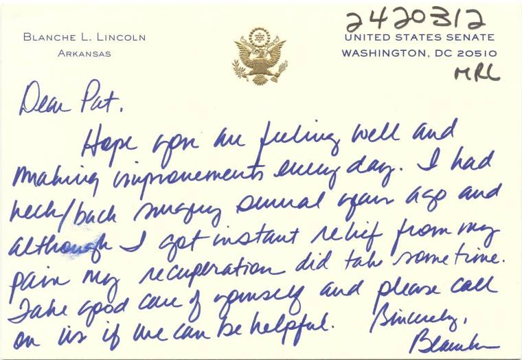 DescriptionHandwritten note from Blanche Lincoln. Written in blue ink on United States Senate letterhead.Status