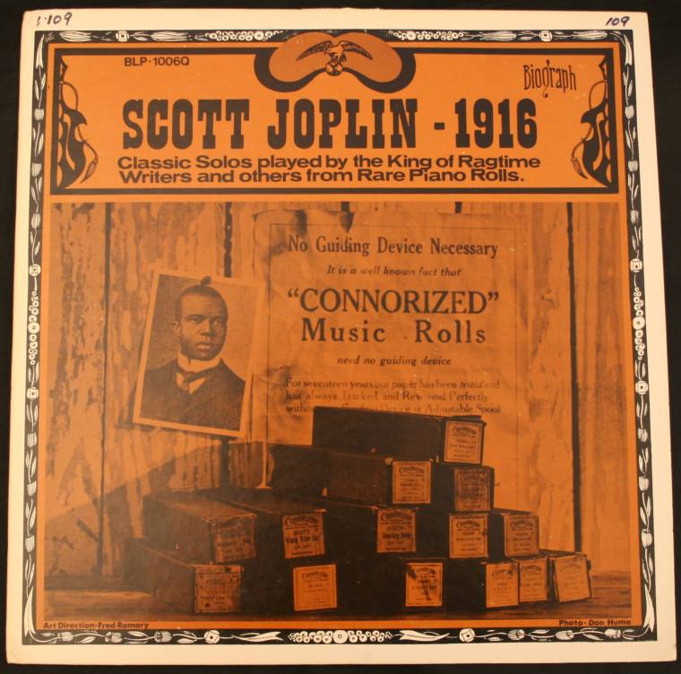 A Scott Joplin album entitled "1916". The album cover features an image of a stack of music rolls in boxes. Behind the boxes, a sign has been placed advertising "Connorized Music Rolls" as well as a photograph of Joplin. The album cover is tinted orange with black print. "Scott Joplin - 1916", "Classic Solos played by the King of Ragtime", "Writers and others from Rare Piano Rolls" are situated at the top of the album cover. "1916" was produced by Biographe Records, Inc. in 1971.