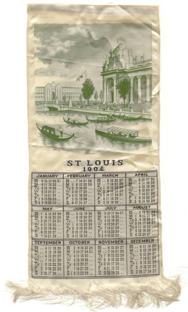 Description1904 World's Fair silk calendar. Picture of Teddy Roosevelt and Thomas Jefferson above the words: "Louisiana Purchase". Compliments of the National Ribbon Company. Fringe along bottom of calendar. Months and days are in red, black and blue ink.