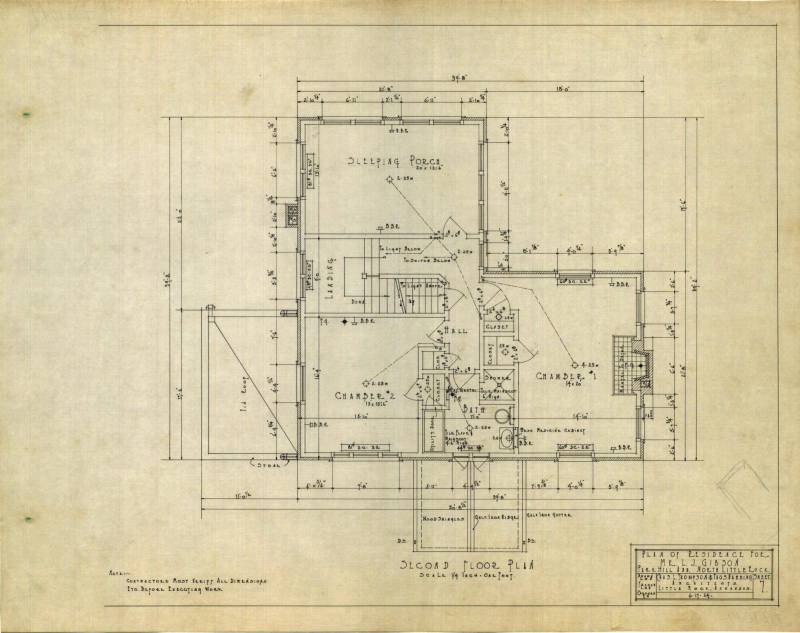 DescriptionCharles Thompson architectural drawing for L.J. Gibson Park in the Hill Add. of North Little Rock, Arkansas. Second Floor Plan-Sheet 7Status