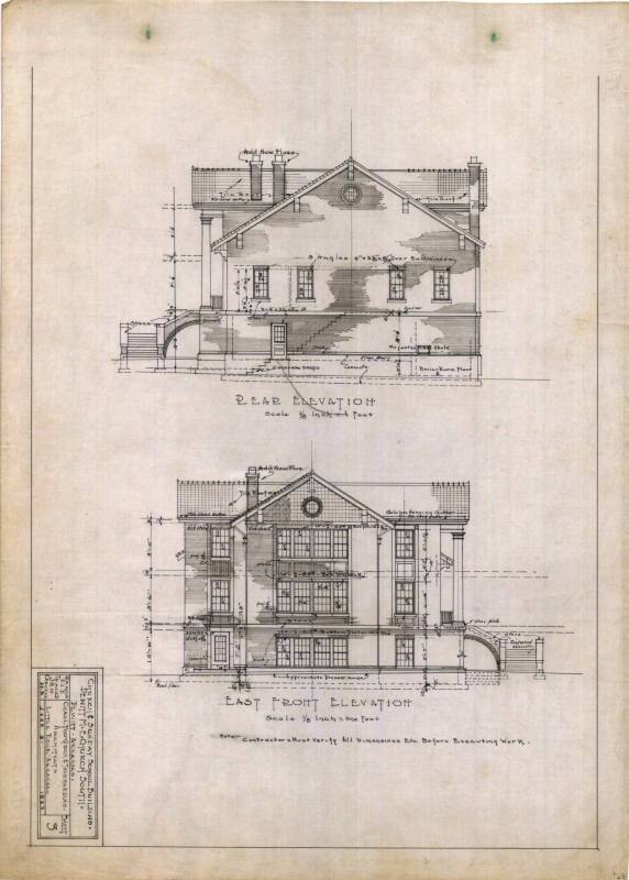 DescriptionCharles Thompson architectural drawing for the Dewitt Methodist Episcopal Church in Dewitt, Arkansas. Rear Elevation and East Front Elevation- Sheet 3Status