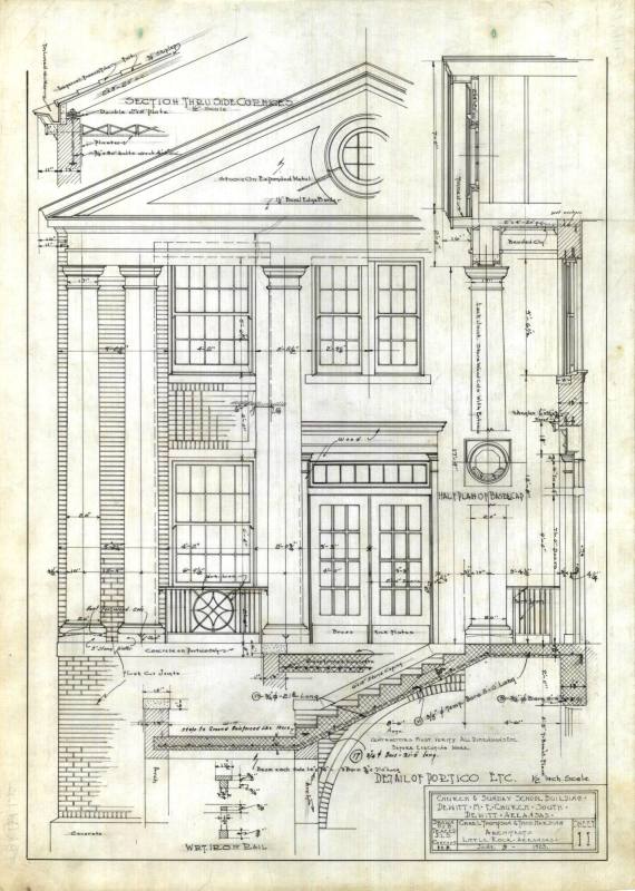 DescriptionCharles Thompson architectural drawing for the Dewitt Methodist Episcopal Church in Dewitt, Arkansas. Detail of Portico-Sheet 11Status