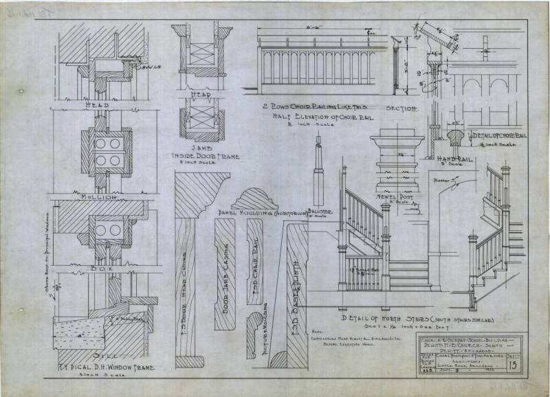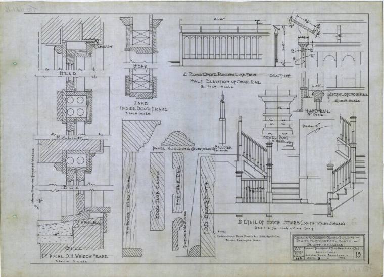 DescriptionCharles Thompson architectural drawing for the Church and Sunday School Building, Dewitt M.E. Church South, Dewitt, Arkansas. Typical D.H. Window Frame, Jambs inside door Frame, Details of North Stairs, Half Elevation of Choir Rail, Detail of Choir Rail-Sheet 15Status