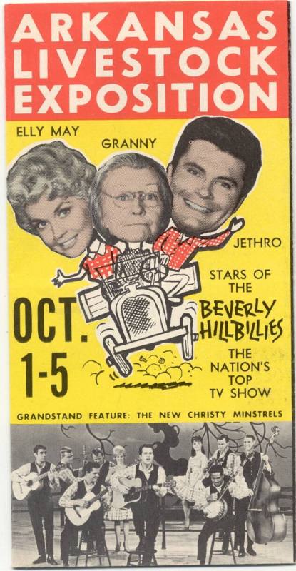 DescriptionArkansas Livestock Exposition Pamphlet Featuring the Beverly Hillbillies; Elly May, Granny, and Jethro are pictured and the poster says: "Stars of the Beverly HIllbillies The Nations Top TV Show - Grandstand Feature: The New Christy Minstrels, Oct. 1-5". The tradition of bringing in celebrities began with the 1939 Arkansas Fair and Livestock Show when Roy Rogers was the featured act.Status