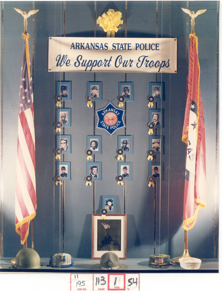 DescriptionPhotograph of the tribute to the Arkansas State Police personnel who were called to active duty during the Gulf War. They were: Captain Winford Phillips, Corporal R.L. Herron, Trooper Ruth Swanigan, Corporal Joe Hutchens, Corporal M.W. Perry, Sergeant Mike Hall, Investigator Chris Anderson, Troop A Dispatcher Linda Dawson, Corporal Joe Lee Wright, Corporal W.W. Adams, Trooper A.D. Cook, Sergeant Jerry Reinhold, Trooper Jim Howington, Trooper Mark Hollingsworth, and Trooper First Class Jose Chacon.