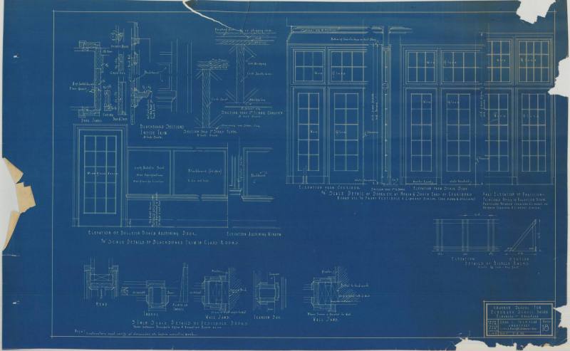 DescriptionCharles Thompson architectural drawing for El Dorado Schools in El Dorado, Arkansas. Board Details of Blackboard Trim in Class Rooms; Details of Vestibule Doors; Detail of Doors,etc. at North and South Ends of Corridors; Details of Bicycle Racks-Sheet 18Status