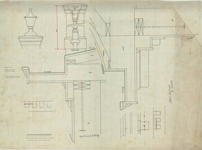 DescriptionCharles Thompson architectural drawing for the Women's Library Association at 600-700 Caddo Street in Arkadelphia, Arkansas. Cornice of Wing; Main Cornice-Sheet 2Status