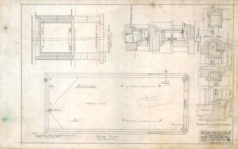 DescriptionCharles Thompson architectural drawing for the Merchants and Planters' Bank at 214 Madison in Clarendon, Arkansas. Roof Plan; Section thru Vault; Double Hung Window Frames; Sill Casement Frames-Sheet 9Status
