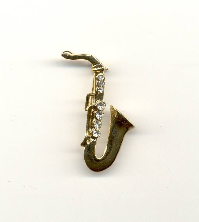 DescriptionA Bill Clinton 1992 presidential campaign saxophone lapel pin worn by Willie Oates. Rhinestones run along the saxophone.