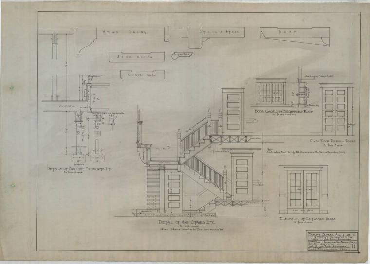 DescriptionCharles Thompson architectural drawing for a Sunday School Addition to the Presbyterian Church at 4th & Maple in North Little Rock, Arkansas. Detail of Main Stairs etc.; Details of Balcony Supports etc.; Elevation of Entrance Doors; Class Room Division Doors; Book Cases in Beginners Room.Status