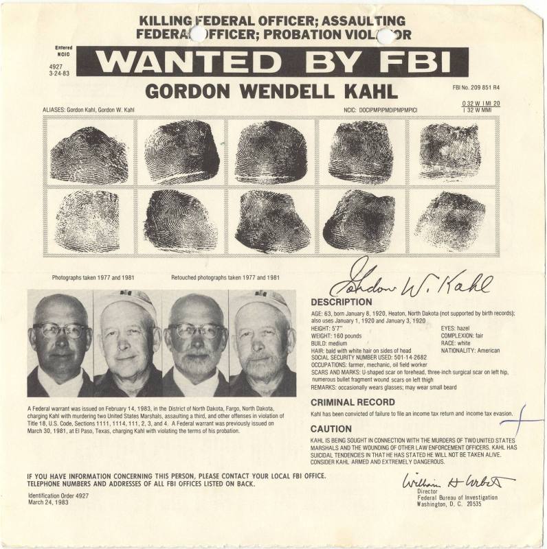 DescriptionFBI reward/wanted flyer issued 24 March 1983 for Gordan Kahl. Kahl was a federal fugitive tax protester who killed a U.S. Marshal and a Deputy U.S. Marshal in North Dakota. He was killed in a shoot out with Lawrence County Police. The Lawrence County Sheriff, Gene Matthews was also killed in the gun battle.Status